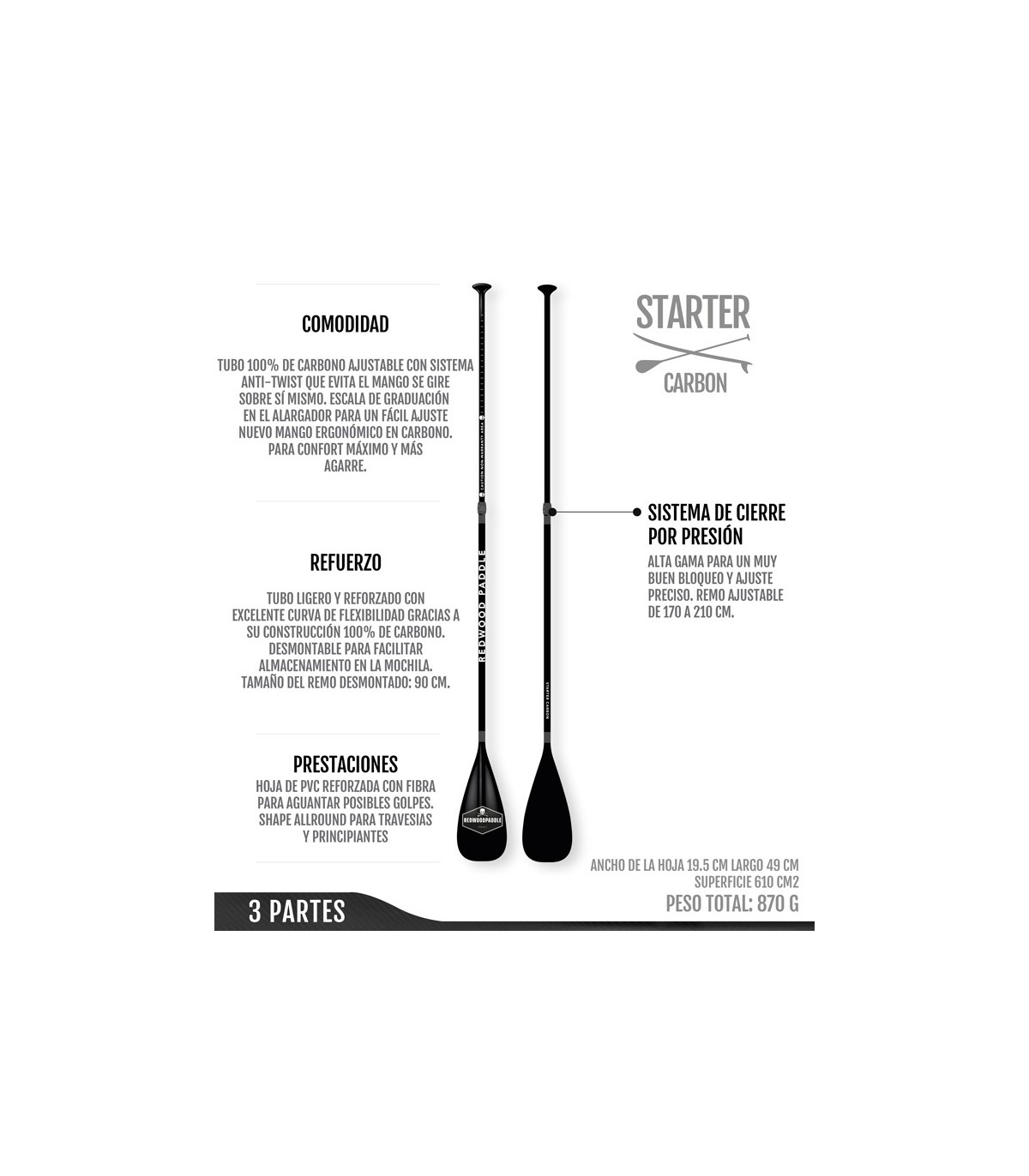 - Desmontable en 3 partes para que sea práctico guadarlo en el maletero del coche o en una mochila junto a su tabla de paddle surf hinchable.