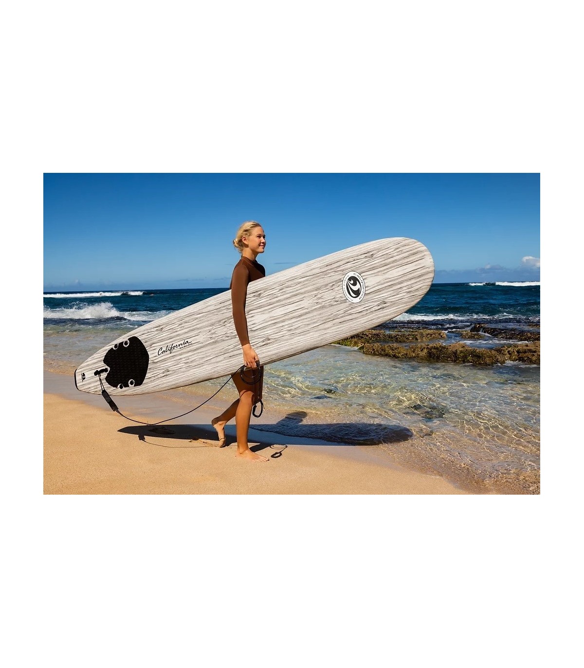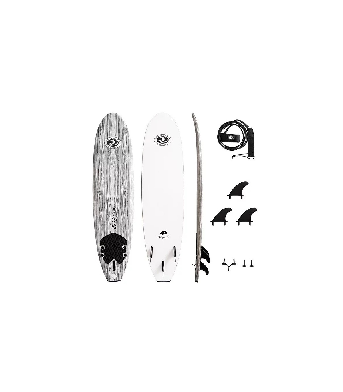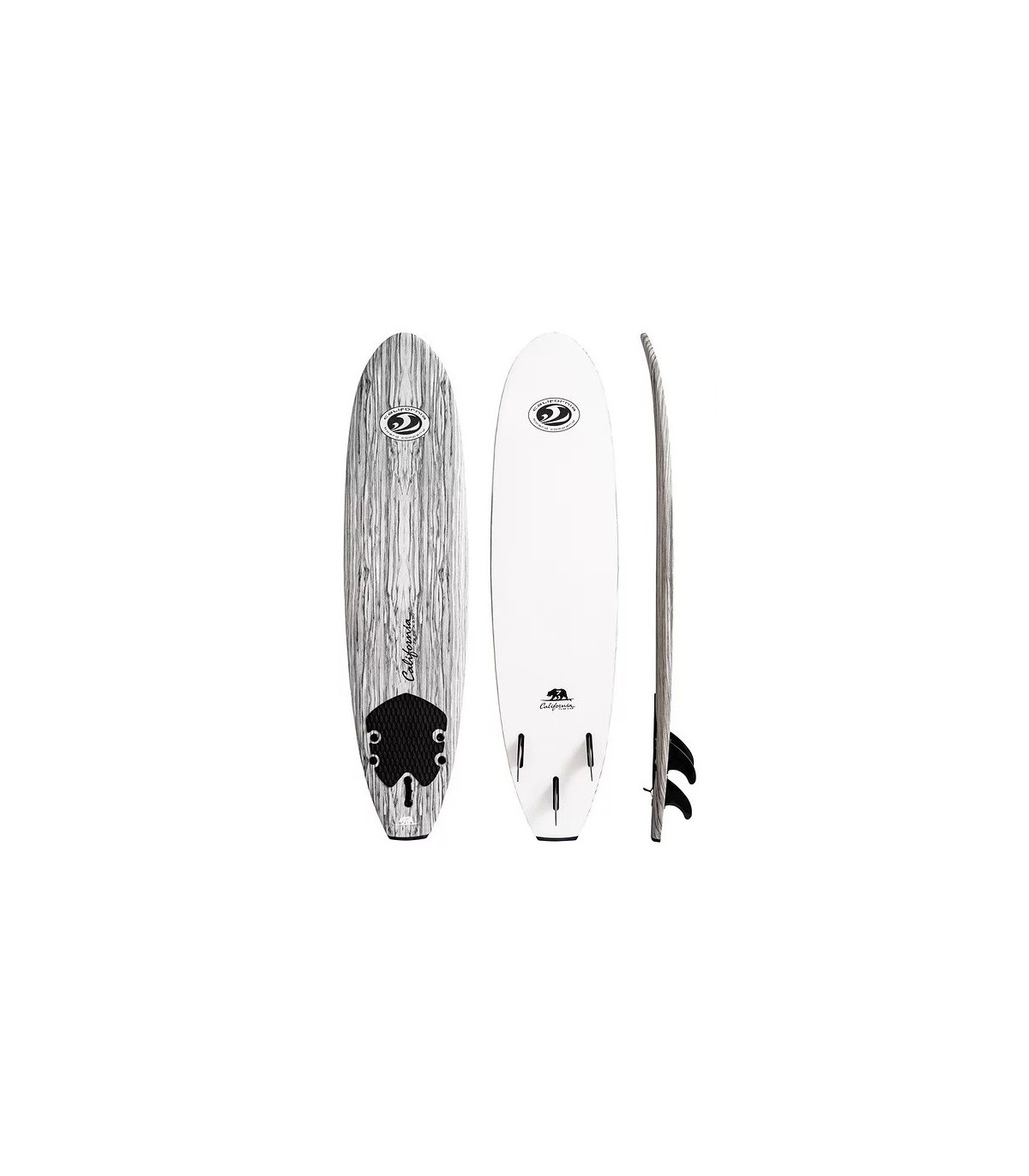 El Soft Surf Bear 7' CBC California Board Company en espuma EPS es la tabla ideal opara iniciarse y progresar de la manera la más segura posible. Fabricada con espuma EPS de alta densidad, es robuta y adecuada para todo tipo de surfistas ligeros o con mas peso para surfear en olas de 50 cm a 1 m 20. Es conocida por su facilidad de uso, su durabilidad, su divertido gráfico de madera que cubre toda la parte superior de la tabla y su precio asequible. Esta tabla de surf soft tiene un núcleo de espuma EPS impermeable con 3 almas de madera incorporadas para una estructura con flexibilidad, un deck en XPE / IXPE que apenas necesita cera para agarrarse y una carena dura de polietileno resbaladizo que se desliza suavemente sobre el agua. También cuenta con un deck pad en la parte trasera, un sistema tr-fin fácil de instalar y quitar; y viene con un leash de surf con una correa de tobillo acolchada de neopreno.